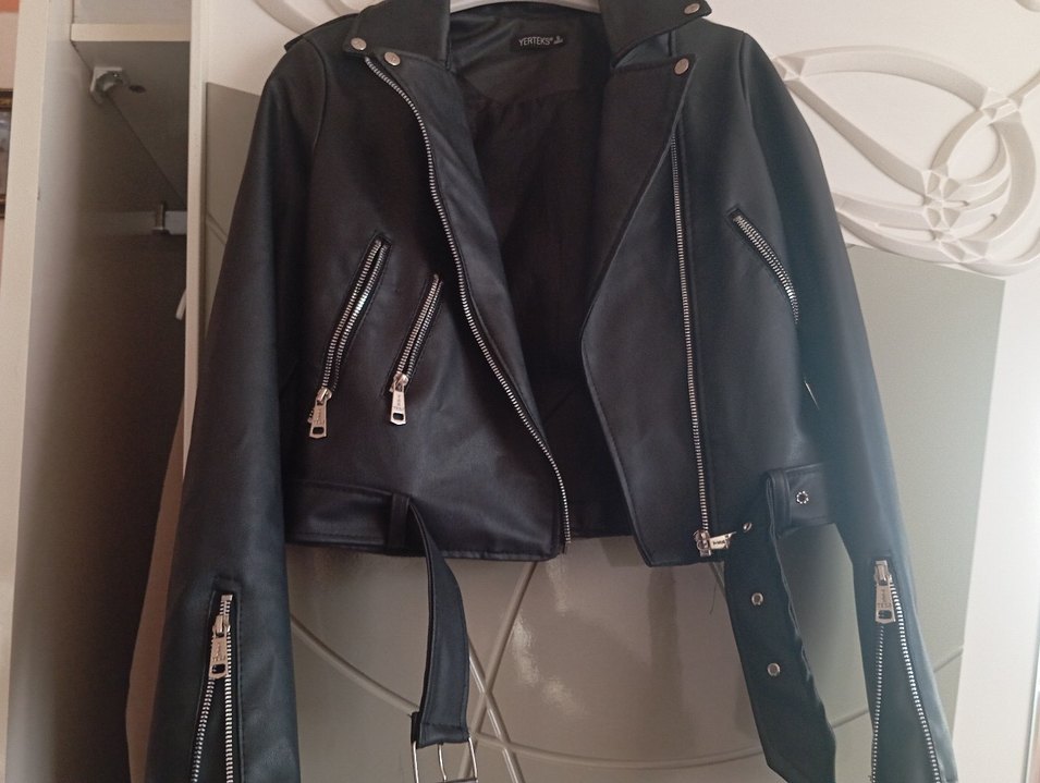 Siyah deri biker ceket, fitted kesim, çıtçıtlı yaka ve fermuarlı detaylara sahiptir. Normal boyda, askılı kolludur, günlük kullanıma uygundur.
