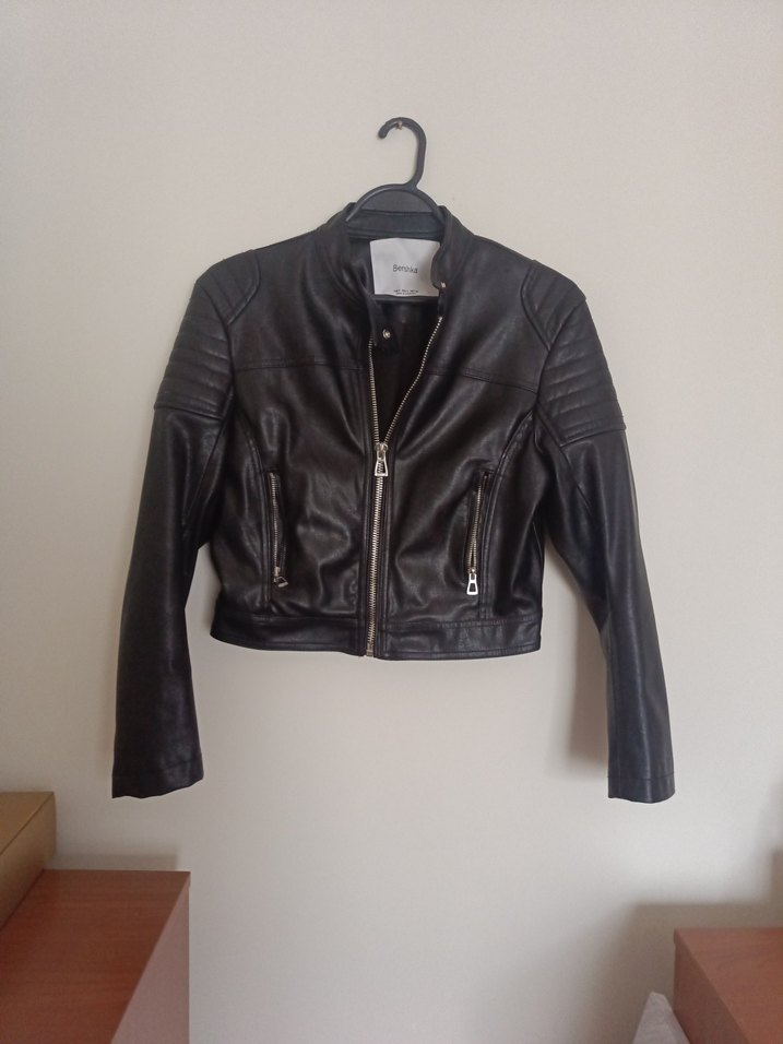 Siyah, dar kesim deri biker ceket, çıtçıtlı yaka ve fermuarlı ceplerle minimalist tarzda.