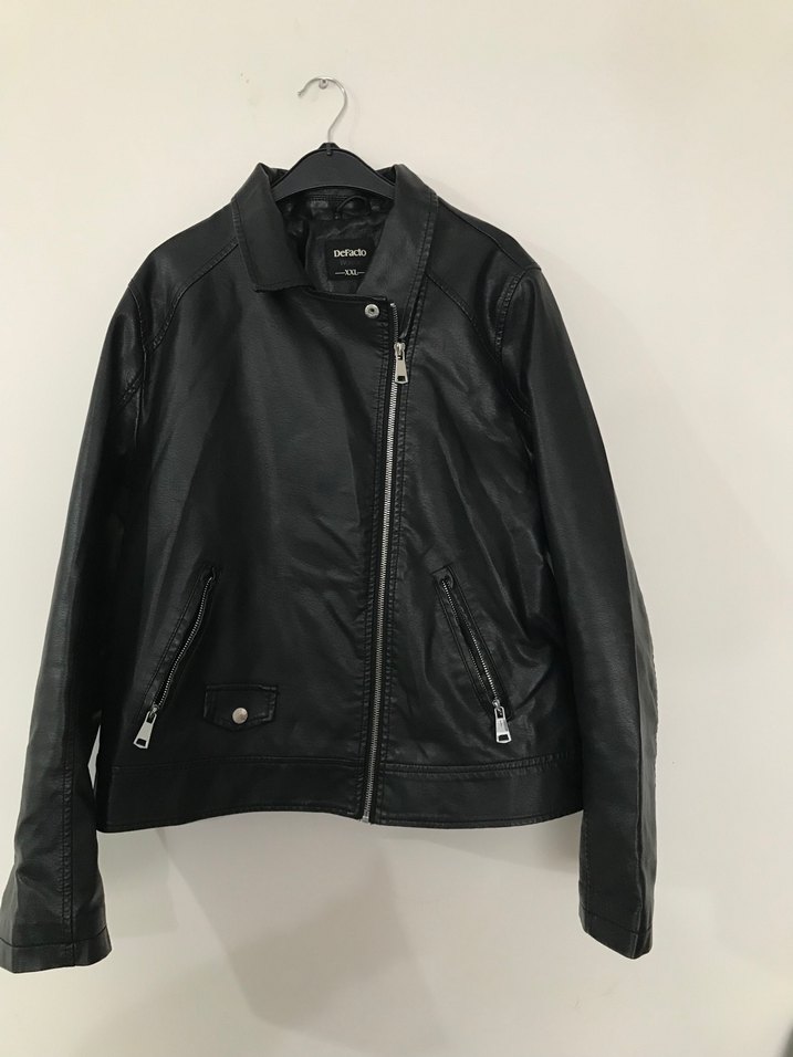 Siyah deri biker ceket, yakalı ve çapraz fermuarlı ceplerle. Tokalı detay ve askılı kollarıyla punk rock havası verir.