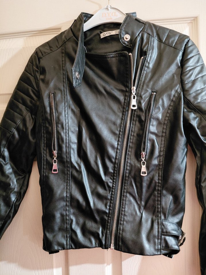 Fermuarlı, strappy kollu, fitted siyah deri biker ceket. Notched lapel yakalı, desen içermeyen koyu renkli rock punk tarzında.