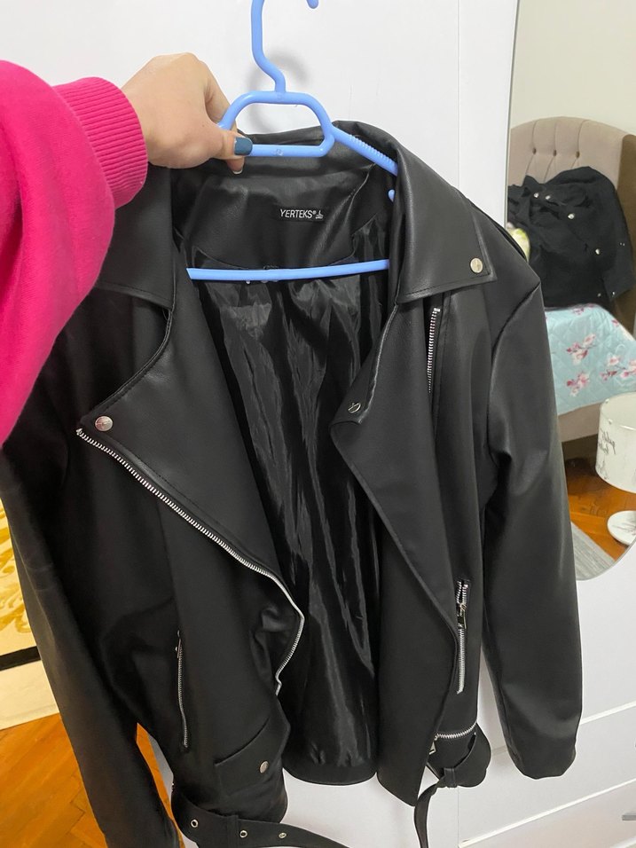 Siyah deri, fermuarlı detaylara sahip, kesimli biker ceket. Normal midi boyda, yakası kesimli ve askılı kollu, trend sokak stiline uygun.