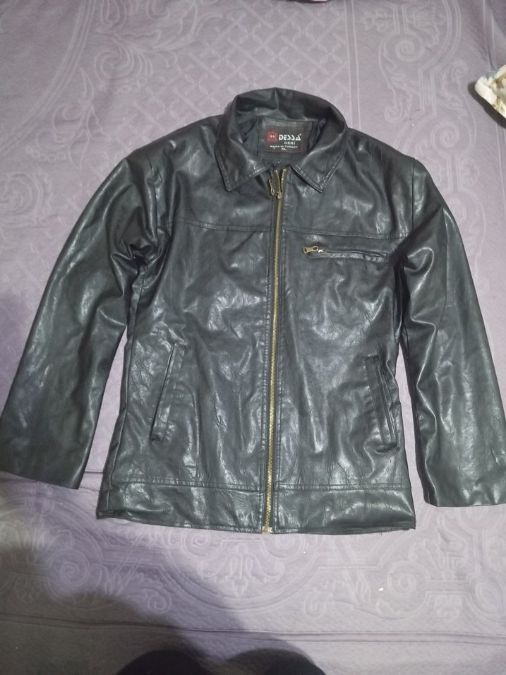 Bu siyah deri biker ceket, kesik yaka ve fermuarlı ceplere sahiptir. Uzun kollu, normal kesim olup günlük kullanım için uygundur.