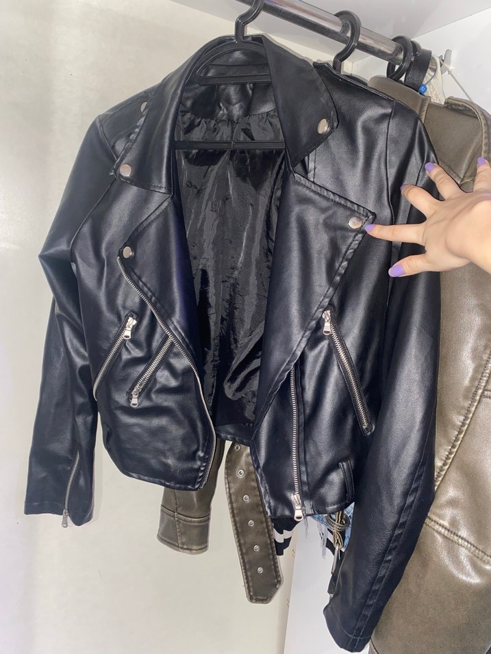Siyah deri, fermuarlı cepler ve keskin yaka detaylı, normal uzunlukta, dar kesim biker ceket. Rock punk grunge tarzını yansıtır.