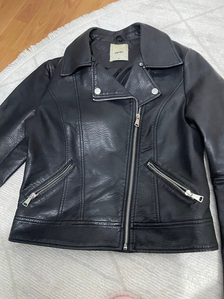 Siyah, fitted deri biker ceket, çentikli yaka ve fermuarlı ceplerle. Strappy kollu, trend bir günlük stil için uygun.