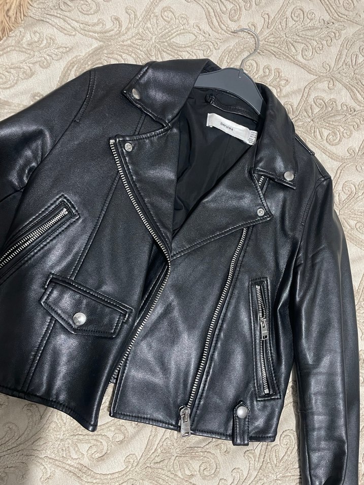 Fitted kesim siyah deri biker ceket, kesik yaka ve askılı kollara sahip. Kürk detaylı, normal midi boyda, günlük kullanım için uygun.