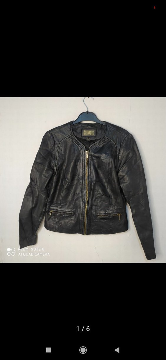 Fermuarlı cepleri ve kesik yaka detayı olan siyah deri biker ceket. Normal kalıp, uzun kollu ve midi boyda, günlük kullanım için uygundur.