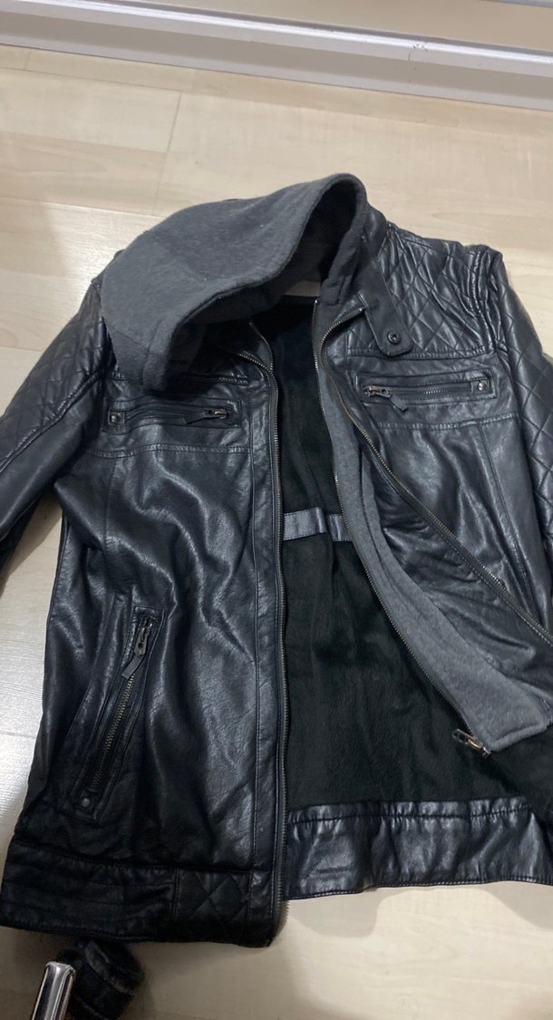 Siyah deri biker ceket, kapüşonlu ve kayış detaylıdır. Normal boyda, kesimi vücuda oturur, günlük sokak stiline uygundur. Fiyat sorun kesinlikle makul ürün iade yoktur