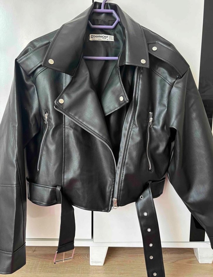 Siyah deri, kemerli, fermuarlı detaylı, kesimli yakalı ve askılı kollu, dar kesim biker ceket. Trendy günlük tarz için uygundur.