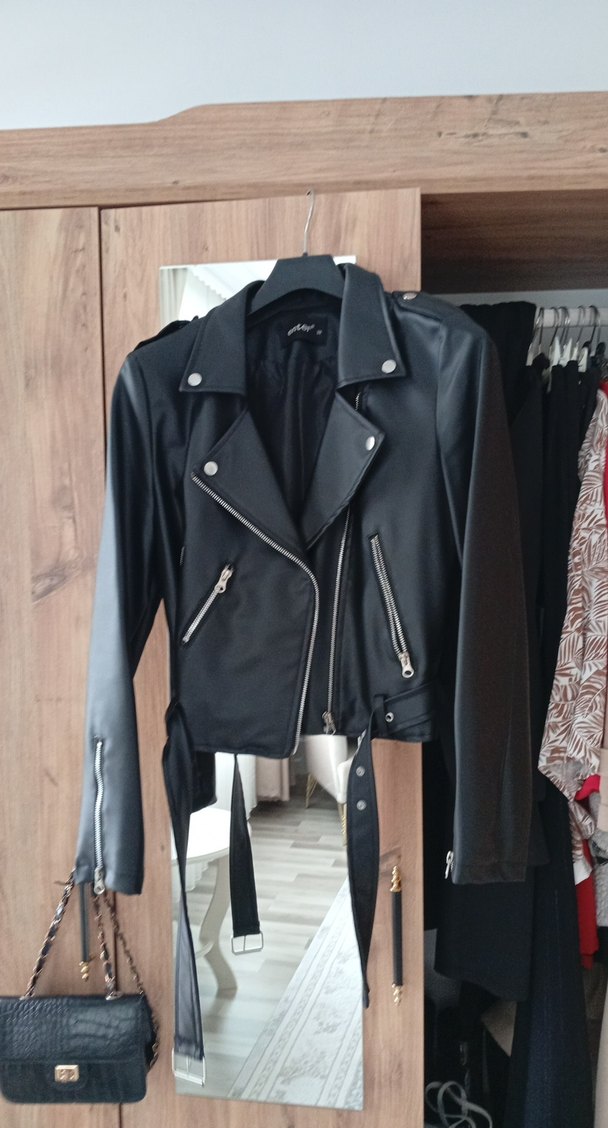 Siyah, kemerli, dar kesim deri biker ceket. Notlu yaka ve askılı kollarıyla günlük kullanıma uygun midi uzunlukta.
