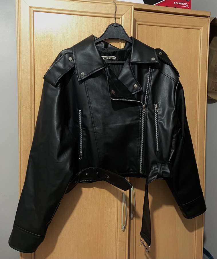 Siyah deri biker ceket, kemerli ve ince kesimdir. Keskin yakalı, askılı kolları ve fermuar detaylarıyla trend bir görünüme sahiptir.