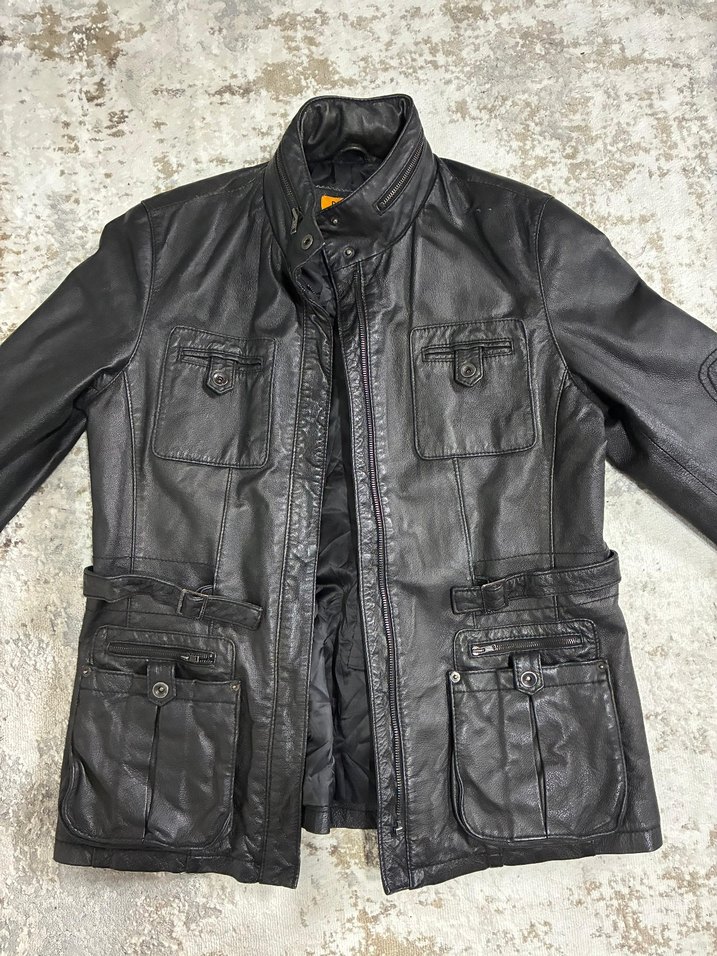 Siyah deri biker ceket, kemerli ve çıtçıtlı yakaya sahip. Uzun kollu, çok cepli ve günlük kullanım için regular fit.