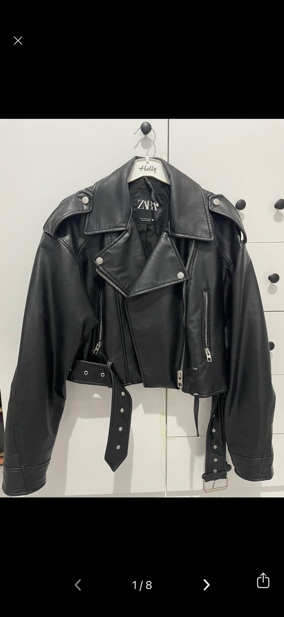 Fitted kesim siyah deri biker ceket, kemerli ve strappy kollu. Notch yaka ve fermuar detaylarıyla, gündelik kullanım için uygun grunge punk tarzı.
