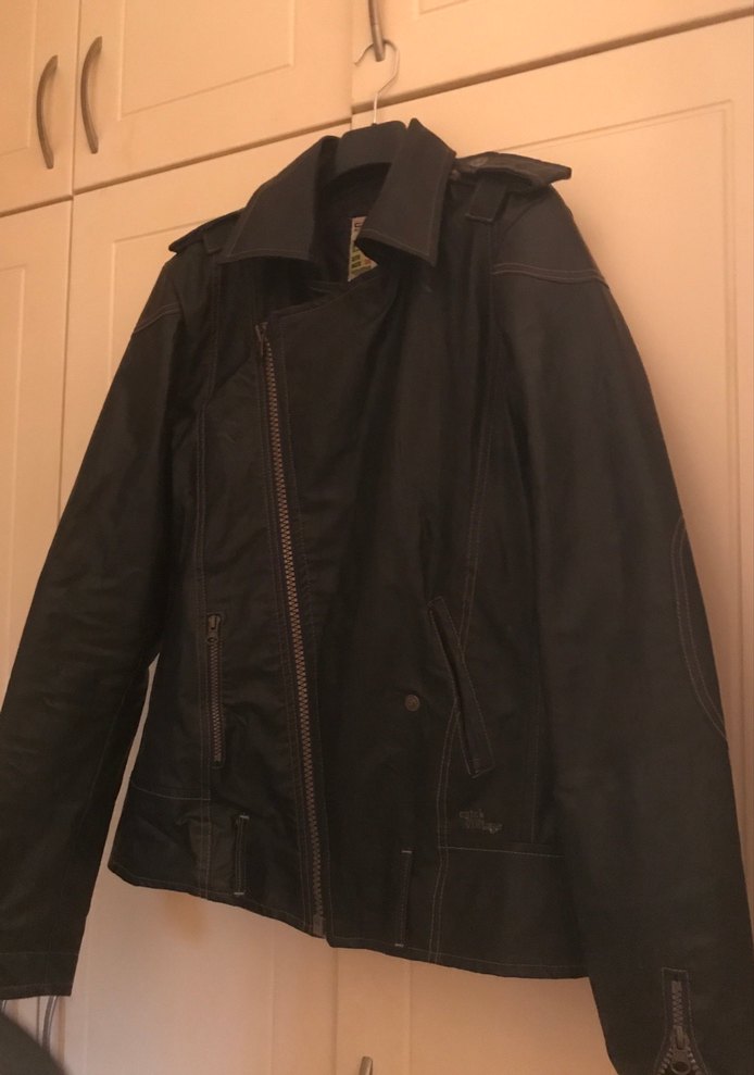 Siyah deri biker ceket, kemerli ve uzun kolludur. Notlu yaka ve normal midi boyuyla günlük kullanıma uygundur.