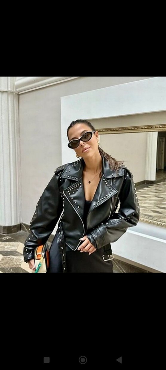 Siyah deri biker ceket, tokalı detaylar ve askılı kollarla, kesik yaka ve baskılı perçinlerle tamamlanmış. Günlük şık sokak stili için uygun. hiçbir sıkıntısı yok