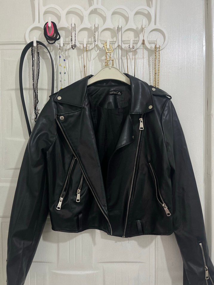 Siyah deri, fitted biker ceket; çıtçıtlı yaka, fermuarlı cepler, strappy kollar ve mini kesimle sokak stili için uygun. Deri kemeri de mevcuttur.