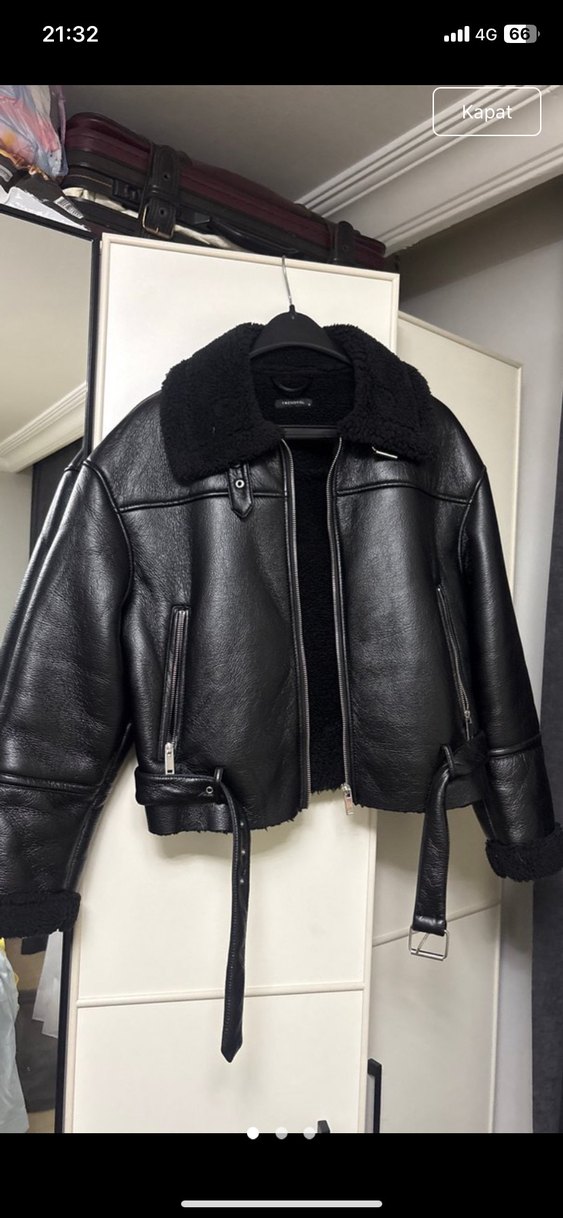 Siyah Deri Biker Ceket, Tokalı, Midi Boy