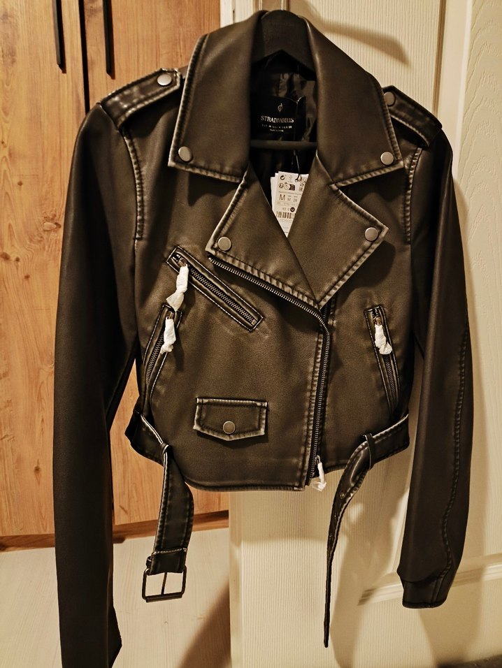 Siyah deri biker ceket, tokalı detaylar ve strappy kollara sahip, kesimi vücuda oturur, günlük şık görünüm sağlar.