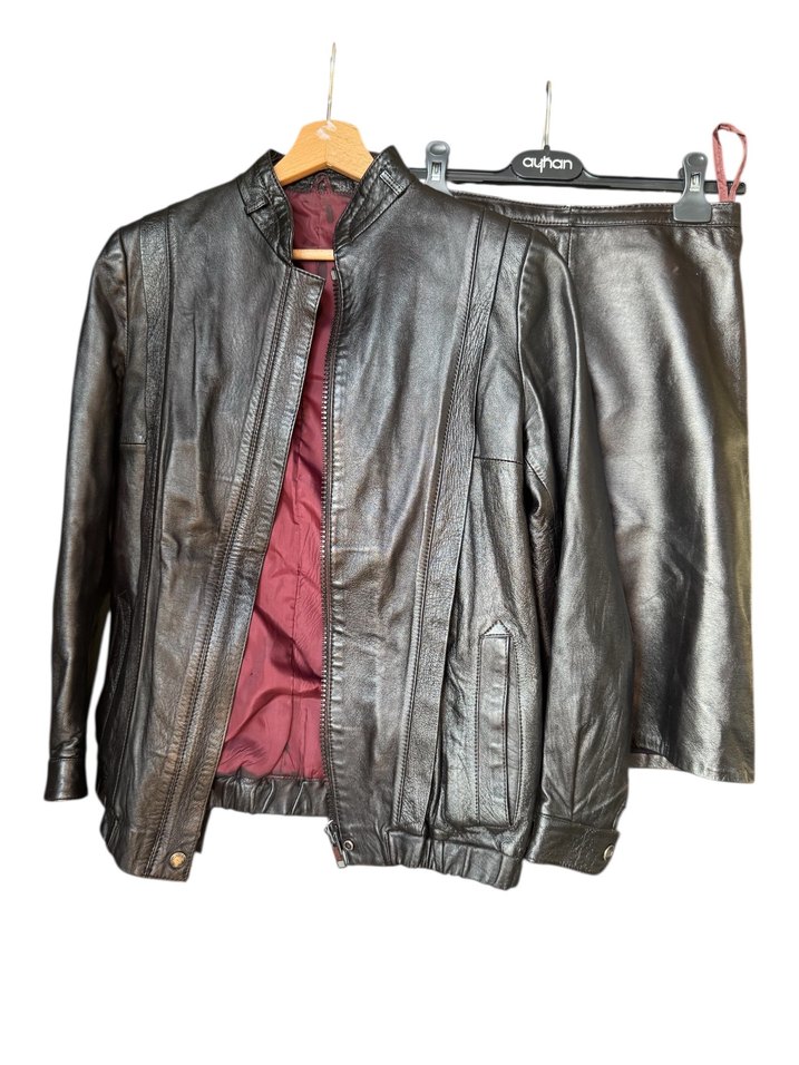 Gerçek deriden harika bir takım. Ürünün eteği xs-s, üstü ise s-m uyumlu. İnce alt vücutlu arkadaşlar tercih etmeli. Yalnızca hammade deri fiyatına satışta. Çünkü oldukça eski bir ürün. Vintage bir ürün. Bunu gözönüne alalım. Yoğun çalıştığım için sorulara yanıt veremiyorum. İçimize sinen parçaları satın alalım.