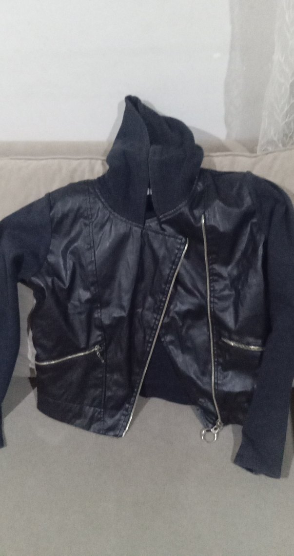 Siyah deri biker ceket, yüksek yakalı ve fermuarlı. Dar kesim uzun kollu, midi boy ve desen içermeyen şık tasarım.