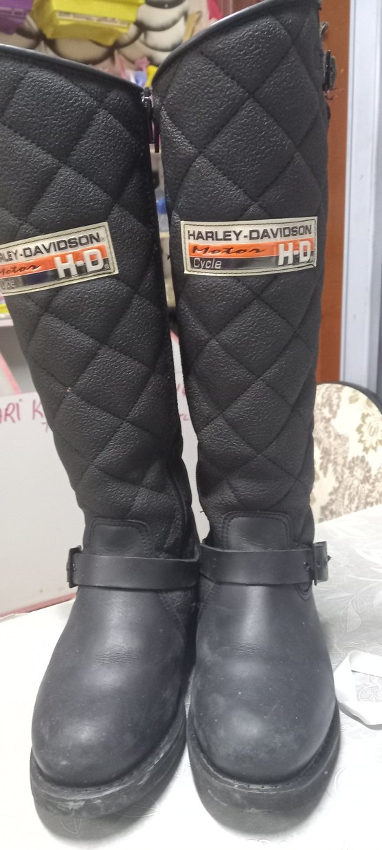 Siyah deri biker dizüstü botlar, yüksek topuklu ve tokalı. Desenli tasarımı ve Harley-Davidson markasıyla sokak stiline uygun. ️