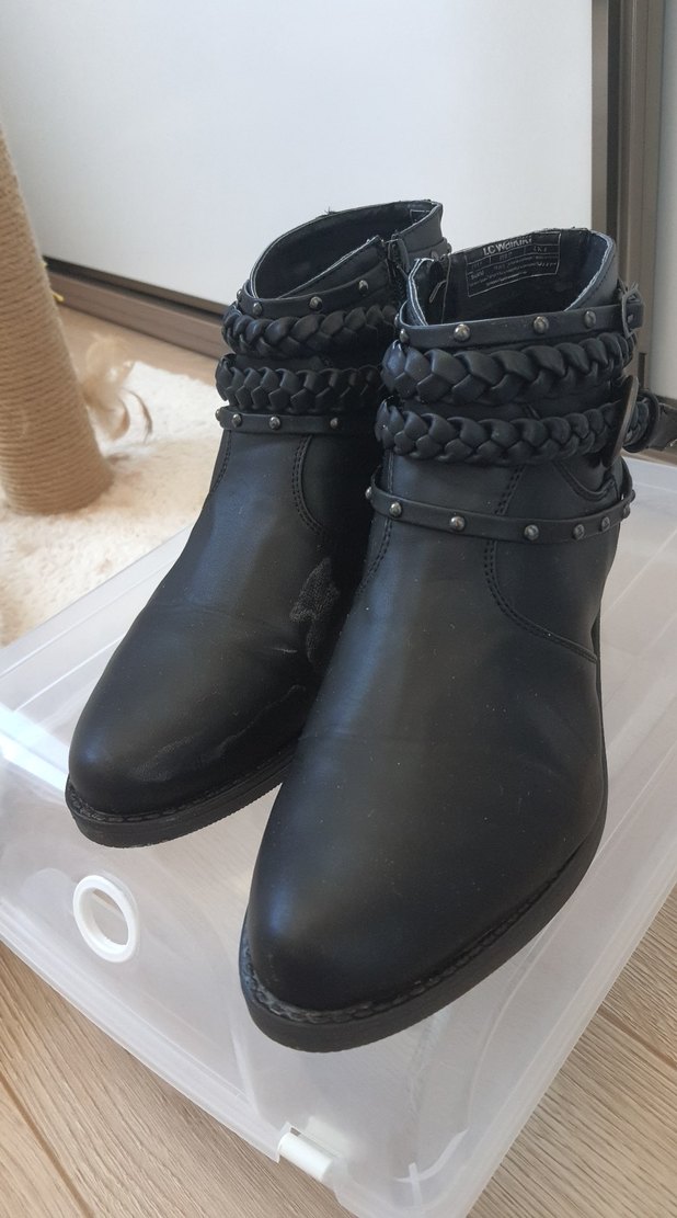 Siyah deri, tokalı ve örgülü detaylı biker kadın botları. Blok topuklu, günlük kullanım için uygun, trend ve gotik tarzda.