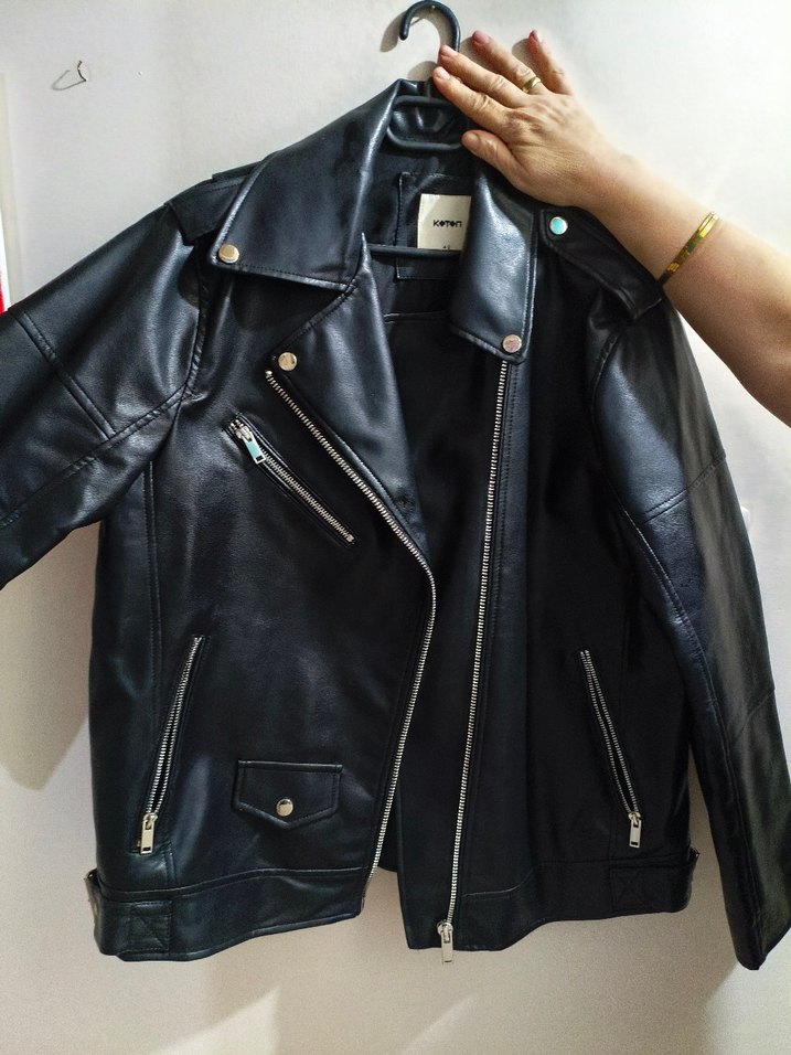 Fitted siyah deri biker kadın ceket, notched lapel yaka ve fermuarlı detaylara sahip. Strappy kollu, trend günlük stil için ideal. 42 beden temiz kullanılmıştır