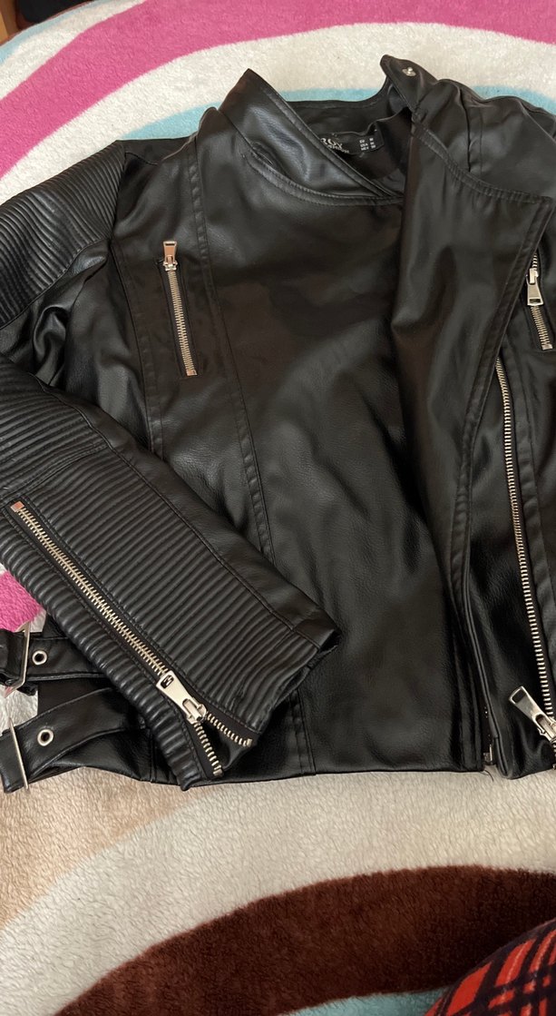Siyah, deri, fermuarlı ve askılı kollu, kesimli biker kadın ceketi. Notlu yaka ve günlük kullanım için uygundur.