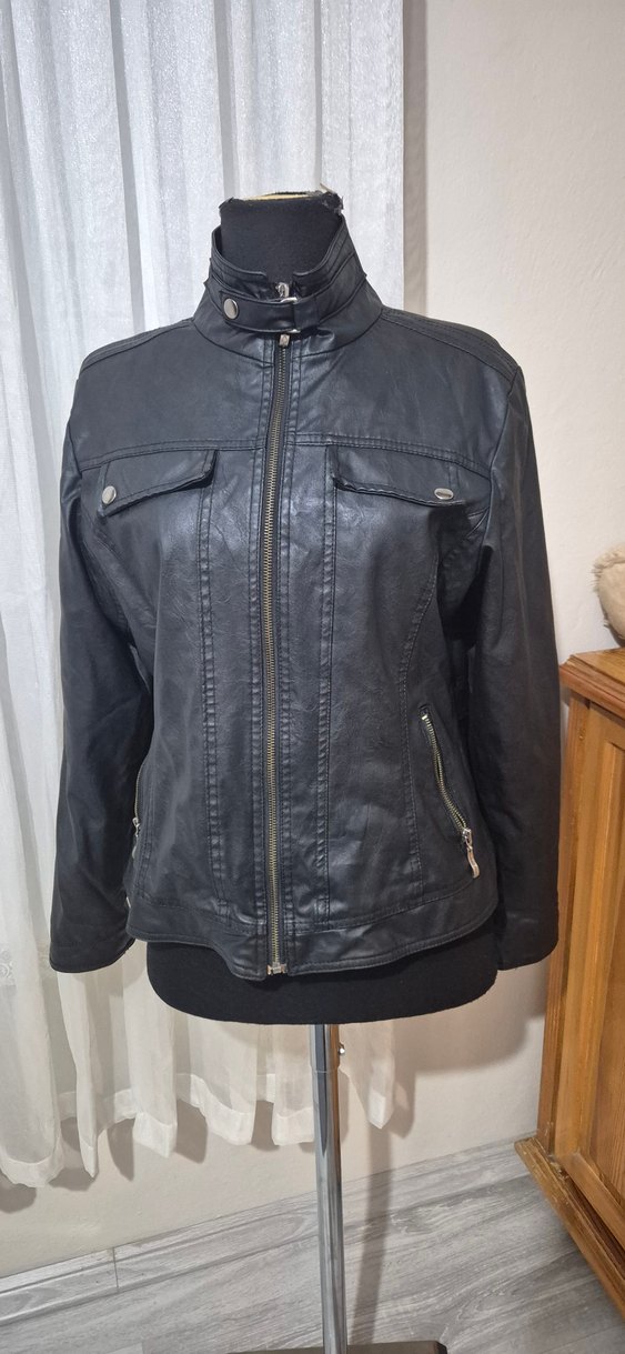 Siyah deri, fermuarlı ve fitted kesim biker ceket. boy 60 cm. Notlu yaka ve askılı kollara sahip, günlük rahat kullanıma uygun.