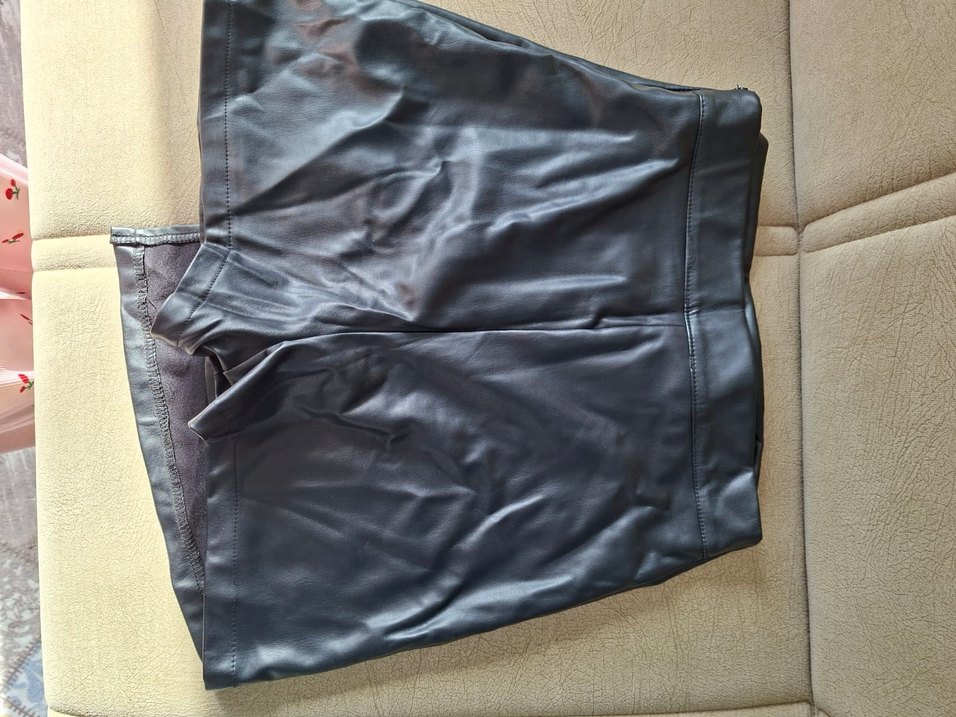 Fermuar detaylı, midi boy, siyah deri biker tarzı dar kesim kadın pantolon.