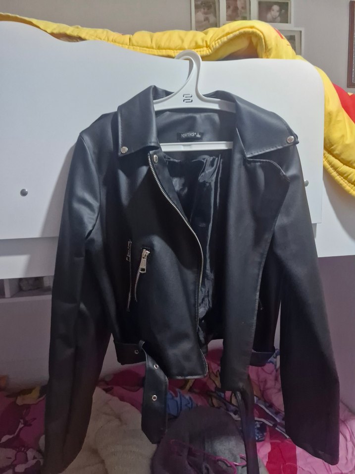 Siyah deri biker ceket, kemerli ve notched yakalıdır. Normal midi boyda, fitted kesim ve askılı kolludur. Trendy casual tarz için uygundur. s-m-l beden uyumlu
