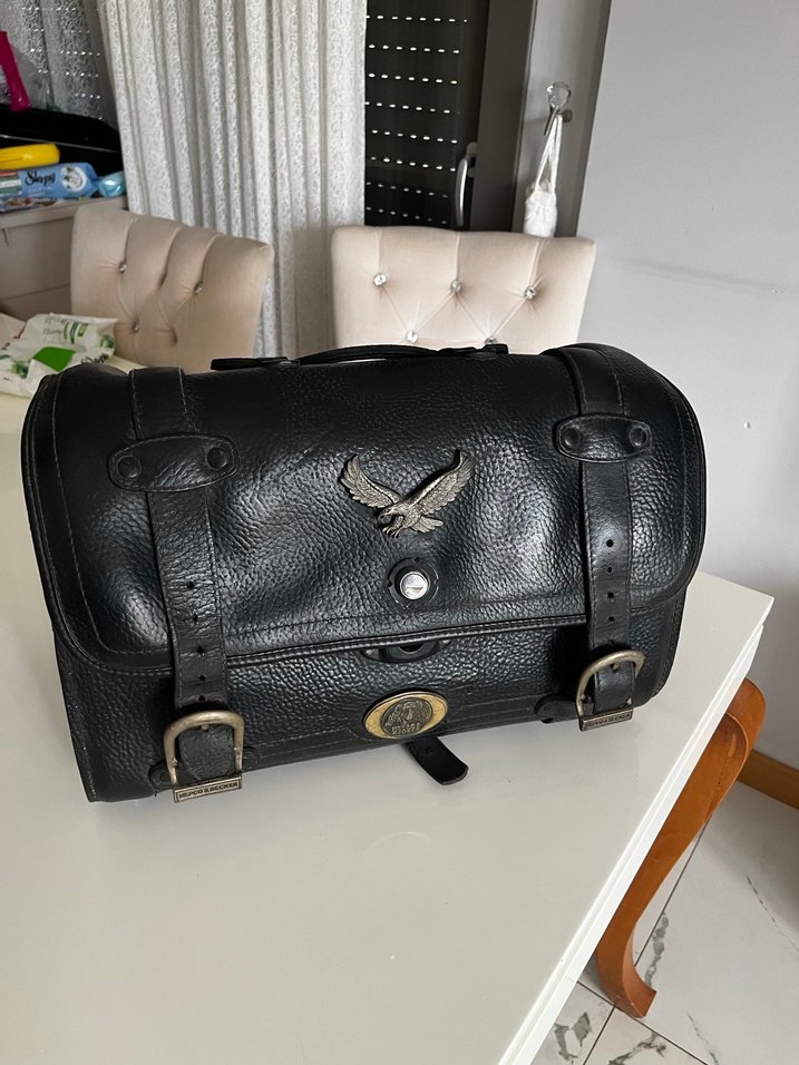 Siyah deri biker tarzı motor çantası, tokalı detaylara ve vintage baskılı kartal figürüne sahiptir. Motor deri çantası. Kusur yok. Ölçüleri: 34 cm x 48 cm x 23 cm x 27 cm.