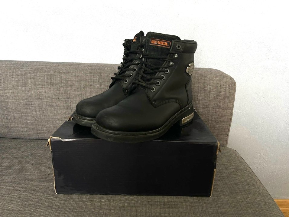 Harley-Davidson logosu bulunan siyah deri biker botlar, platform topuklu ve tokalıdır. Gotik tarzda, günlük kullanıma uygundur.