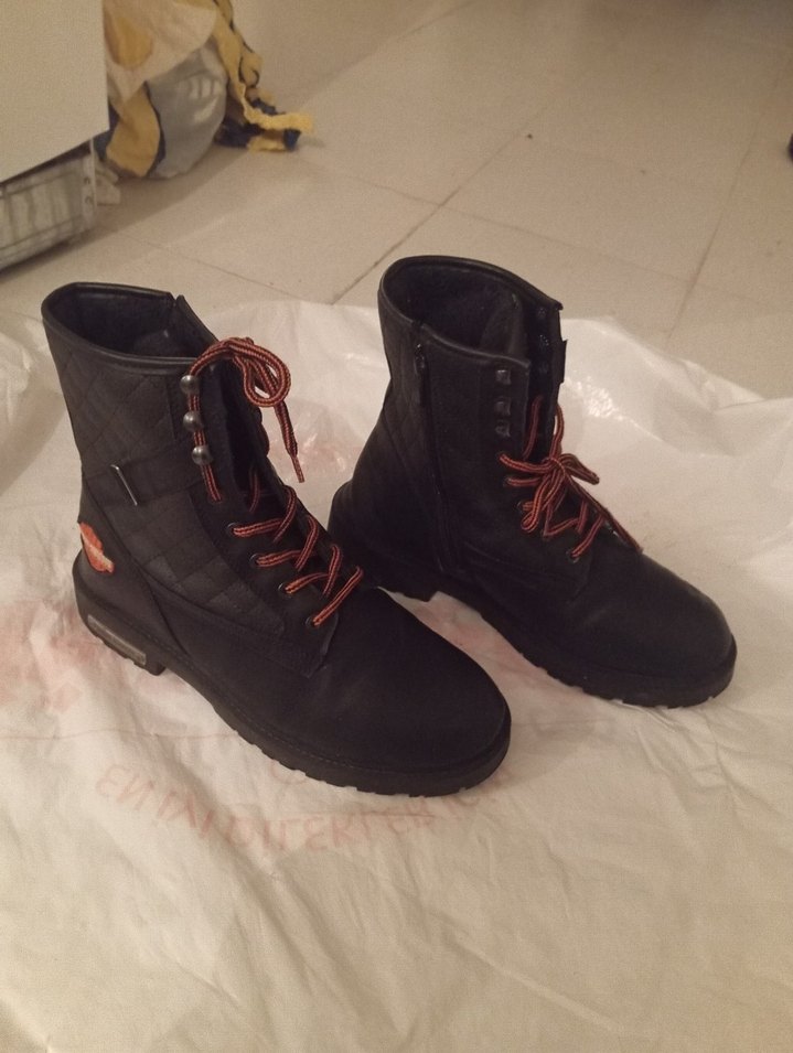 Siyah deri biker botlar, stiletto topuklu, tokalı detaylı ve bağcıklı, günlük şık kullanıma uygun.
