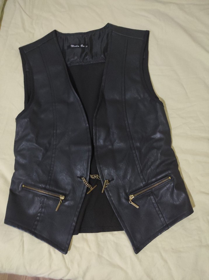 Siyah deri biker yelek, fitted kesim, yakalı ve tokalı detaylara sahiptir. Fermuarlı cepler ve kolsuz tasarımıyla şık bir görünüme sahiptir.