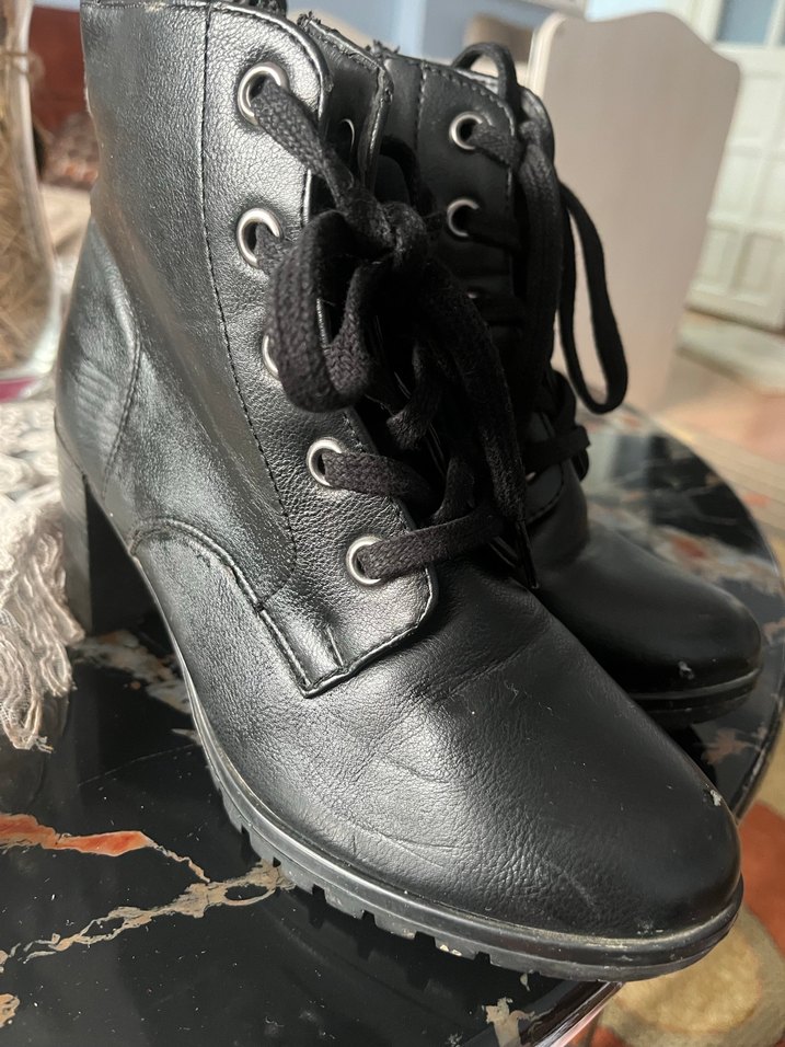 Siyah deri blok topuklu, bağcıklı ve tokalı botlar, hafif yılan derisi desenli. Günlük kullanım için goth punk tarzında.