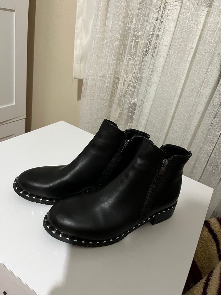Siyah deri, topuklu kadın bot. Tokalı ve perçin detaylı tabanlarıyla günlük kullanıma uygun, goth tarzda.