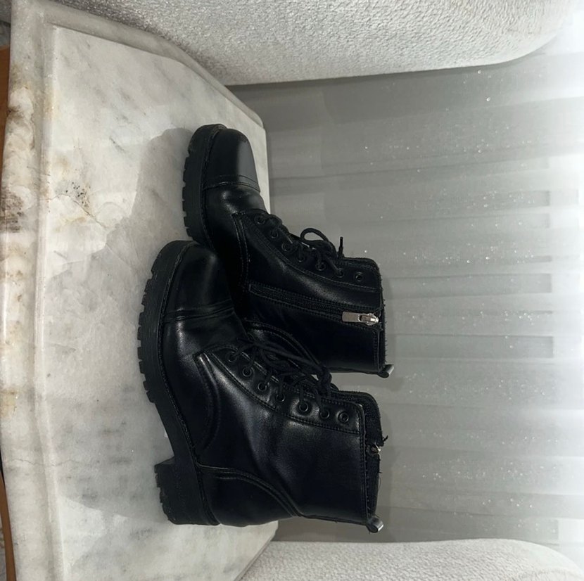 Siyah deri, blok topuklu ve tokalı detaylara sahip kadın botları. Yan fermuarlı ve desensiz tasarımıyla goth ve grunge punk tarzını yansıtır. Günlük kullanıma uygun.