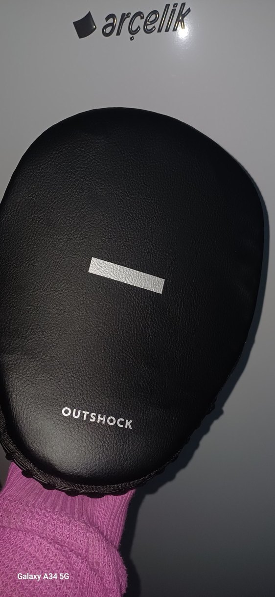 Siyah deri erkek boks lapası "OUTSHOCK" markalı, desen içermeyen düz yüzeye sahiptir. Temiz kullanılmıştır Decathlon markadır hiçbir sorun sıkıntısı yoktur