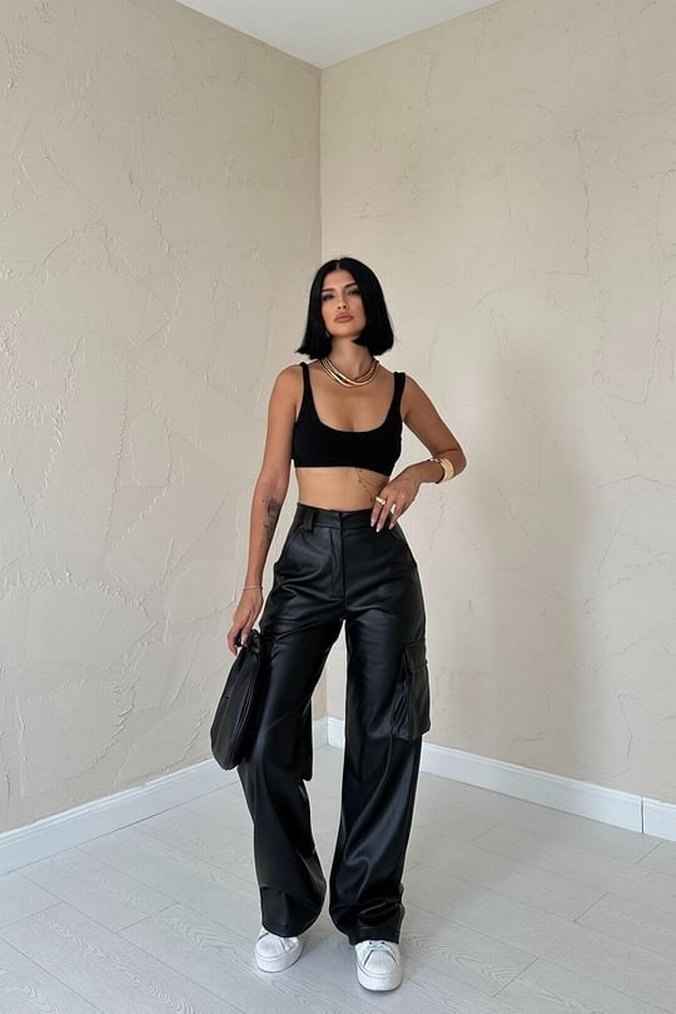 Siyah deri bol kesim midi pantolon, günlük kullanım için rahat ve şık bir sokak stili sunar. S-M-L olarak mevcuttur.