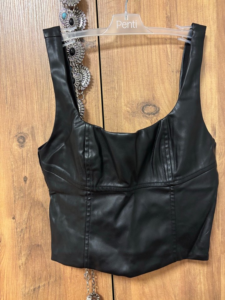 Siyah deri askili bustiyer. Vücuda oturan kesime sahiptir.