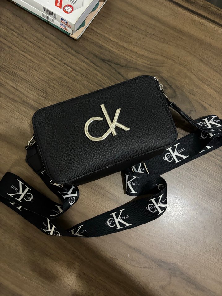 Tokalı kayışlı siyah deri çapraz çanta, Calvin Klein logosu ve baskılı detaylarla. Çok az kullandı temiz ürün