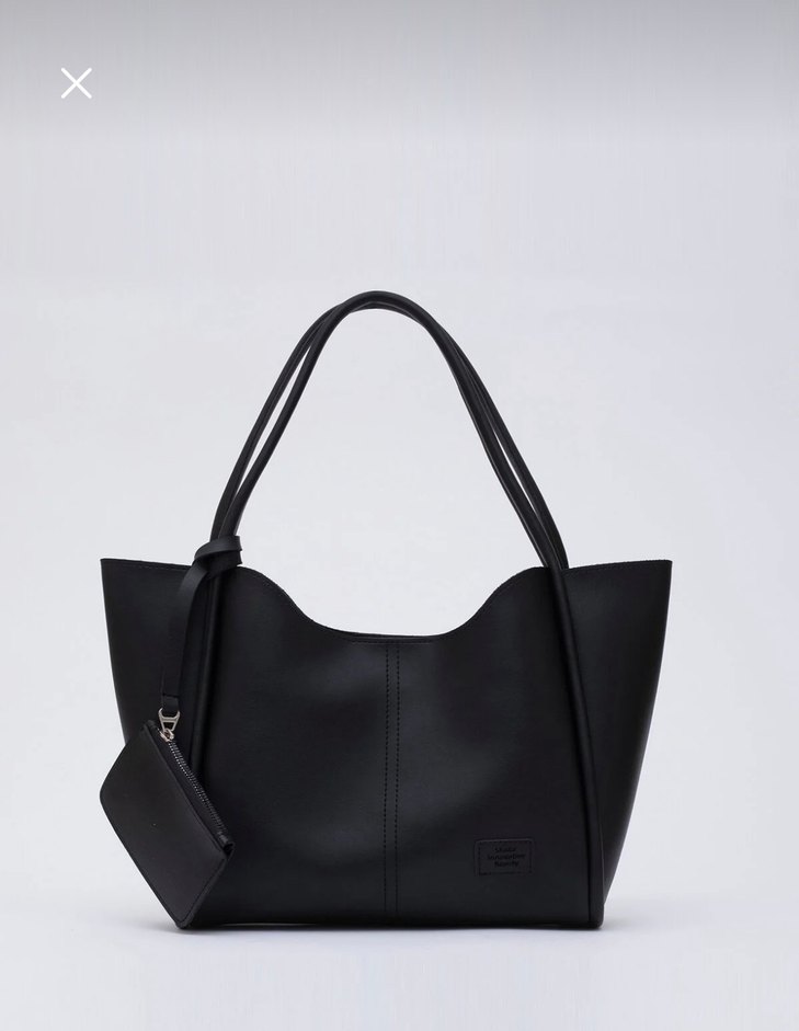 Siyah deri, çift saplı ve küçük cüzdanlı minimalist kadın çantası, rahat sokak stili için uygun. Daha büyük bi çantaya ihtiyacım var ondan satıyorum