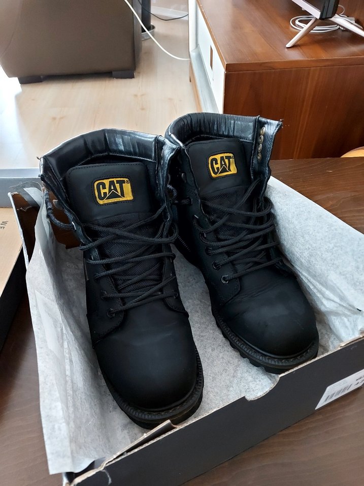 CAT markalı siyah deri botlar. Taş gibi sağlam ayakkabılardır sadece iç astarında çektiğim aşınmalar oldu, dış kısmında derisinde kolay kolay defo olmaz.