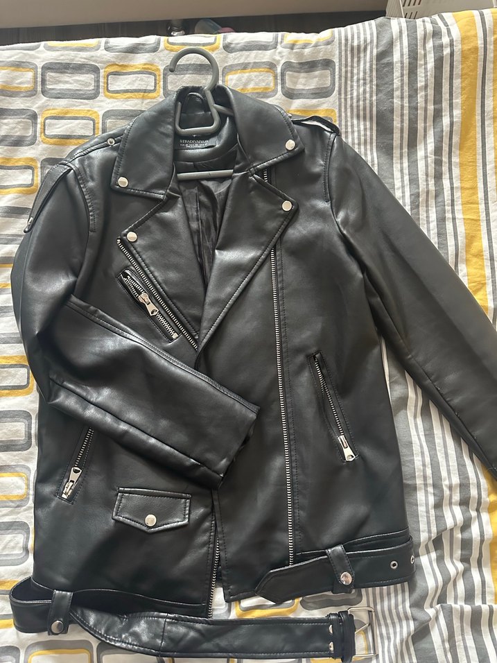 Siyah deri, tokalı ve kayışlı biker ceket. Normal uzunlukta ve regular fit, grunge punk tarzına uygun. Sadece kollarında hafif tarazlanmalar vardır. Fakat asla belli olmuyor. Xs fakat kalıbı geniş. Small giyenler için de uygundur.