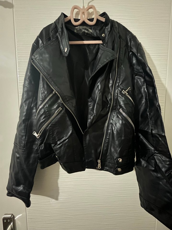 Fermuarlı, notalı yaka ve askılı kollu siyah deri biker ceket. Normal uzunlukta, grunge punk tarzında günlük kullanıma uygun.Ürünün kırışık olma sebebi katlı kalmasıdır giydikçe düzslir modeli kırışık değildir