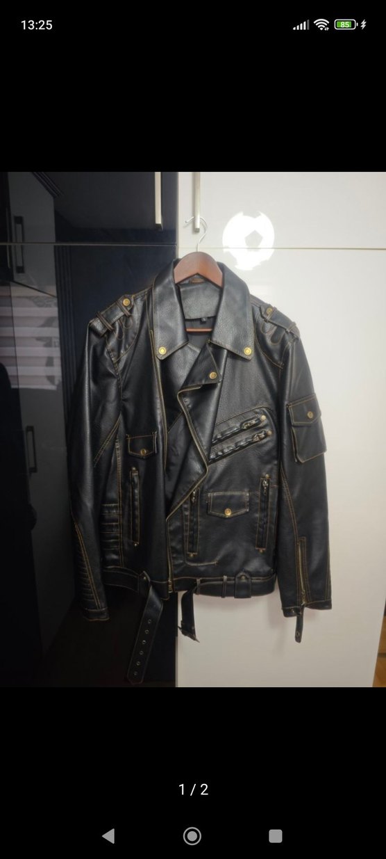 Siyah deri biker ceket, yakasında çıtçıtlı ve tokalı detaylar bulunur. Askılı kollu ve normal kesim, günlük kullanıma uygun grunge punk tarzı. metalci suni deri