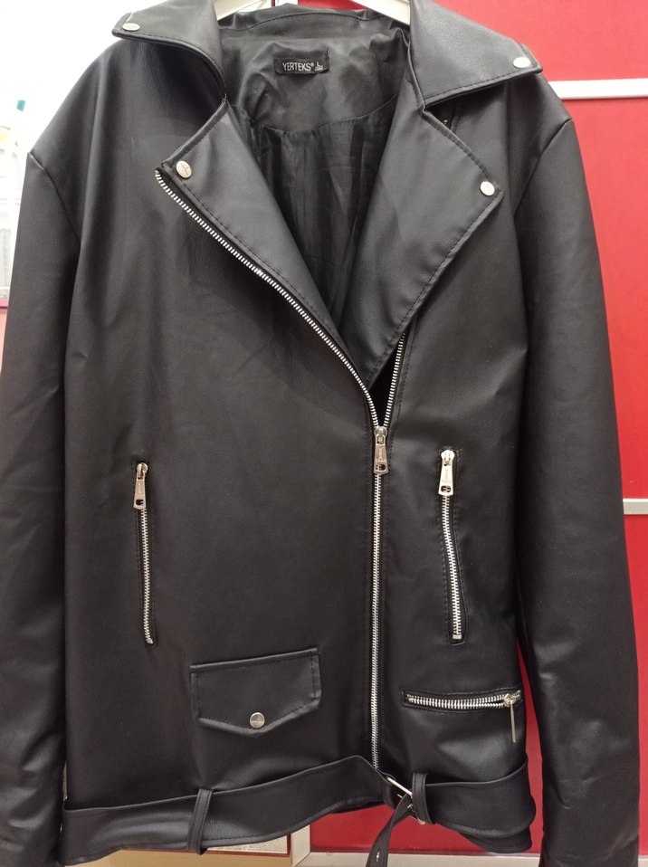 Siyah deri biker ceket, çıtçıtlı yaka ve fermuarlı ceplerle. Normal kalıp, askılı kollu, sokak stiline uygun.