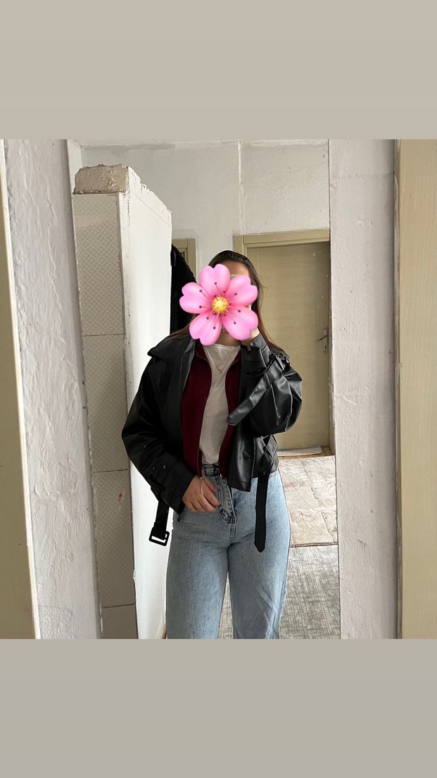 Yüksek yakalı, kemerli detaylı siyah deri ceket. Uzun kollu, , rahat kesim sokak stili çok şık 38 beden ama 40 giyen kişiyede olur indirim için mesaj atmanız yeterlidir