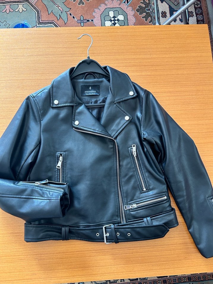 Siyah deri ceket, kemerli ve kesik yakalı. Normal kesim, kayışlı kollu ve fermuarlı ceplidir. Sokak stili için uygun.