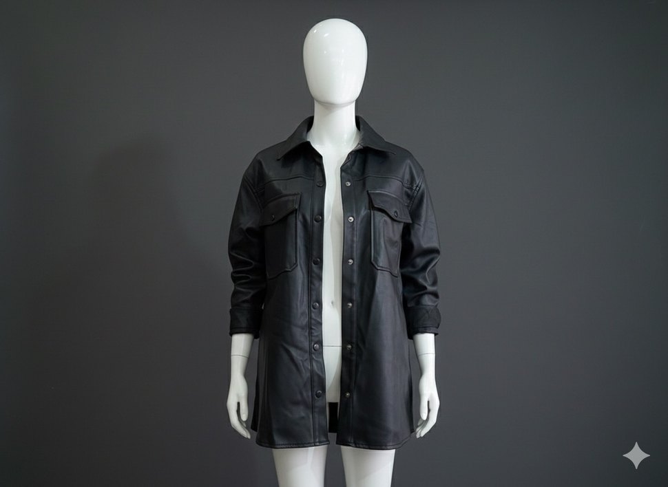 Boy: 71 cm (Uzun kesimi sayesinde hem ceket hem de kısa elbise/gömlek olarak kullanılabilir.) • Kumaş: %100 Yüksek Kaliteli Polyester (Gerçek deriyi aratmayan, yumuşak dokulu suni deri görünümü.) • Tasarım: Önü düğmeli, göğüs hizasında kapaklı cepleri ve şık gömlek yakasıyla modern bir görünüm sunar. Oversize kesimi sayesinde konforludur. • Durum: Yeni